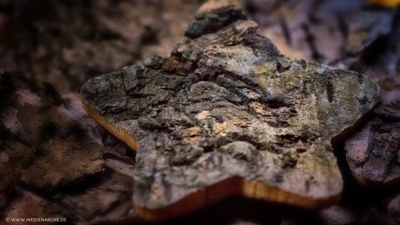 Großaufnahme von einem Stern, der aus Baumrinde geschnitzt ist, inmitten von weiterer hölzernen Struktur.