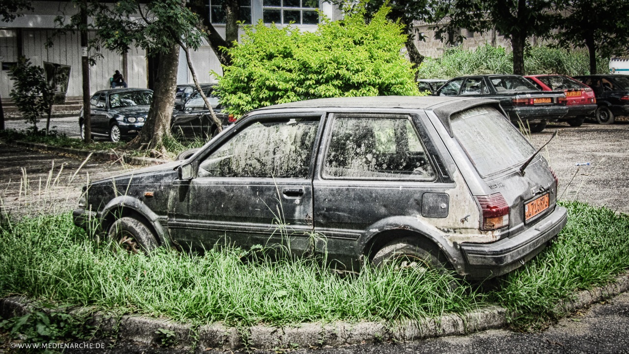Ein heruntergekommenes Auto, das verwahrlost in einer Verkehrsinsel steht.