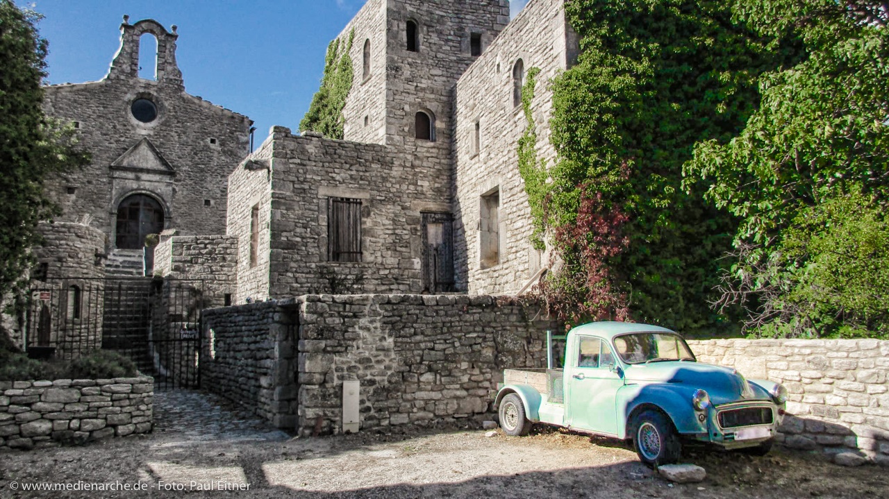 Schlüsselworte: Auto, Burg, Geborgenheit, grau, Kirche, Mauer, Oldtimer, Ruhe, Schutz, Sommer, Sonnenschein, Steine