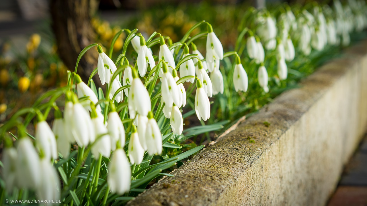 Ein Beet mit vielen Schneeglöckchen im Frühling.