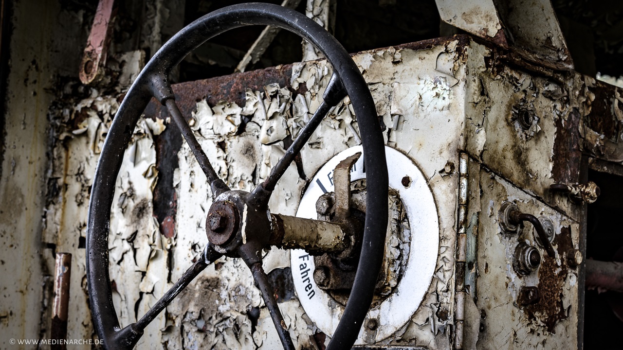 Schlüsselworte: alt, düster, Lokomotive, nachdenklich, Steuerrad, Transportmittel, Vertrauen, Zeit