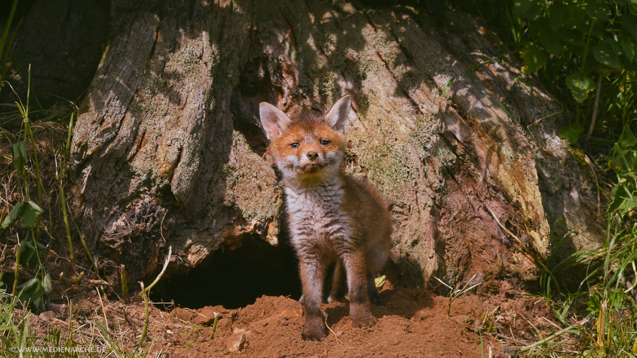Schlüsselworte: Bau, Baum, Baumstamm, braun, Erde, Erwartung, Foto, Frühling, Fuchs, Gras, Grashalm, grün, Hoffnung, Land, Landschaft, Natur, Neugierde, Pflanzen, Schöpfung, Sommer, sonnig, Tiere, Versteck, Verstecken, Welpe