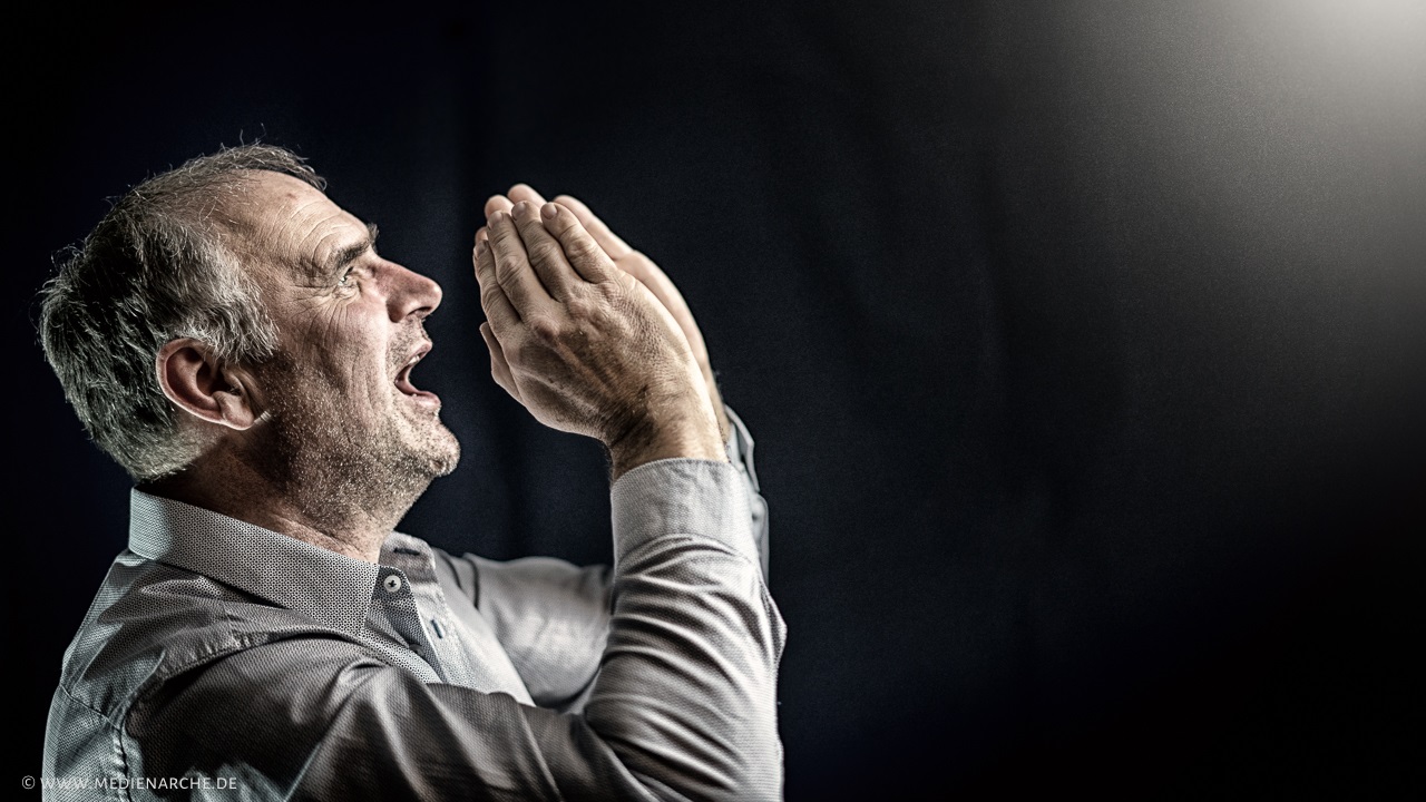 Ein Mann der laut am rufen ist. Inspiriert durch Kolosser 1,9: Wir bitten Gott, dass er euch erkennen lässt, was sein Wille ist (NeÜ). - Im Gebet geht es nicht darum, Gott auf uns hören zu machen, sondern auf Gott zu hören.