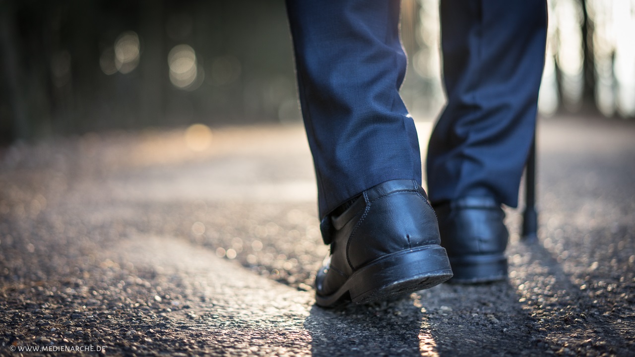 Nahaufnahme Beine eines Spaziergängers im Abendlicht