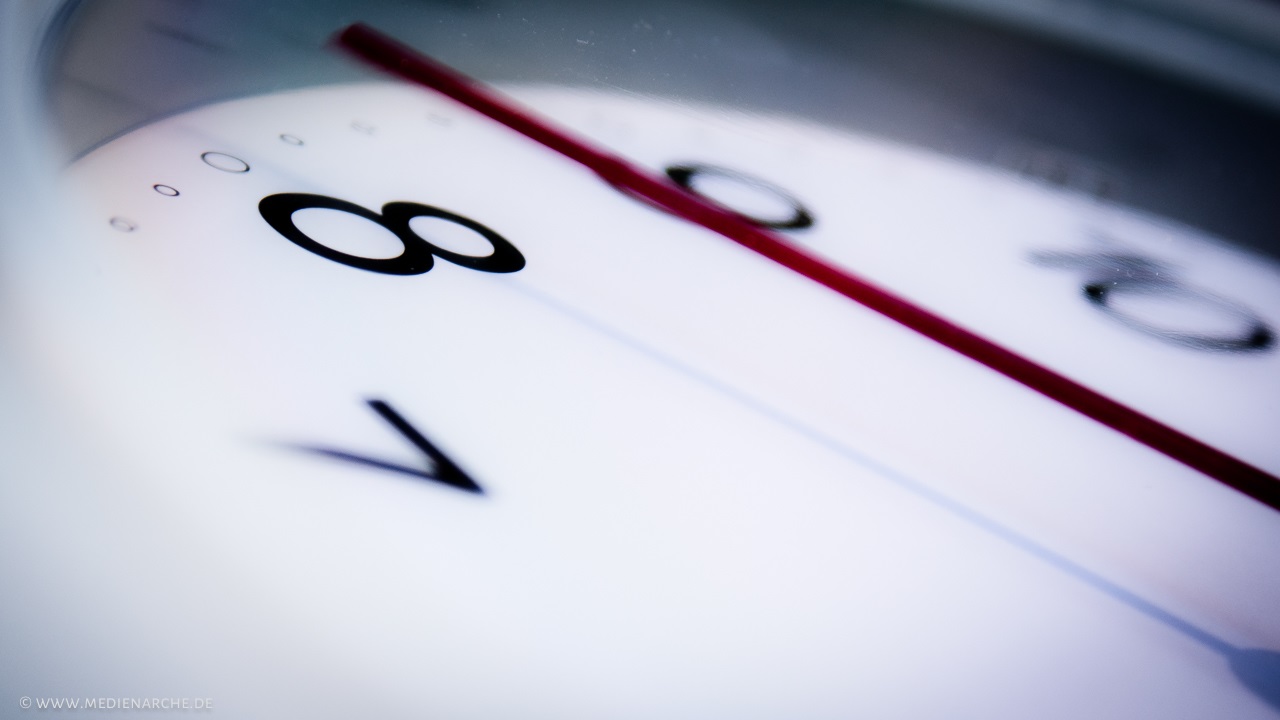 Nahaufnahme einer Wanduhr mit rotem Sekundenzeiger