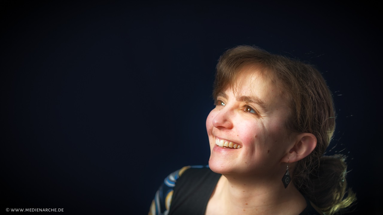 Ein Freude ausstrahlendes Gesicht einer Frau. Inspiriert durch Lukas 1,28: Hebt den Kopf und richtet euch auf, denn dann ist eure Erlösung nicht mehr weit (NeÜ).