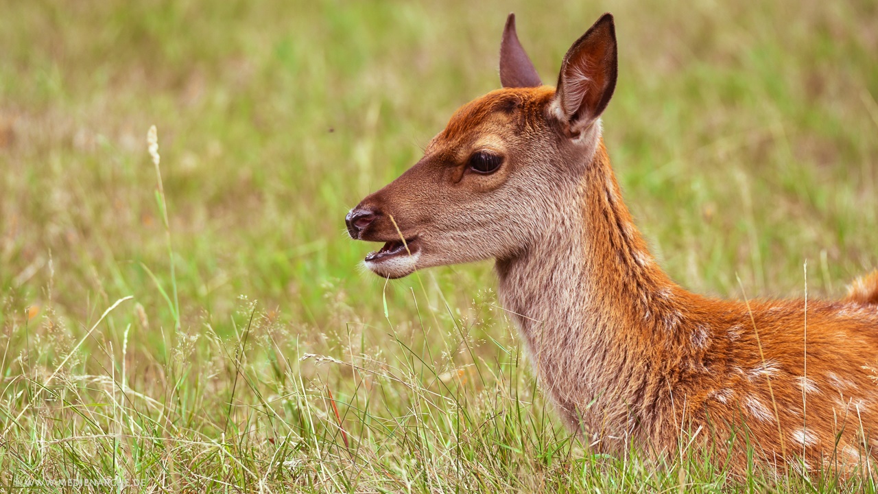 Ein Rehkitz, das auf einer Wiese spaziert.