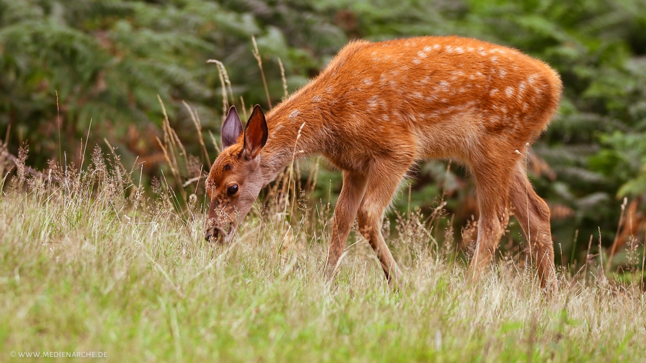 Ein auf einer Wiese grasendes Rehkitz.