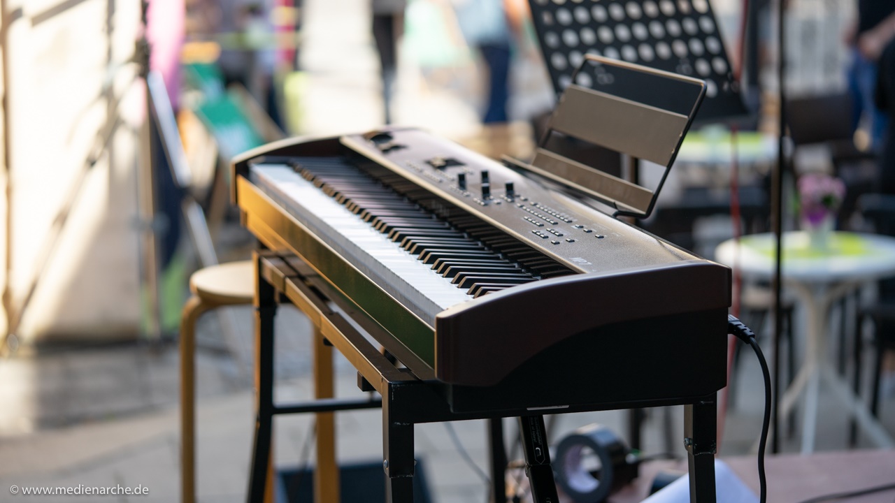 Ein E-Piano auf einer Open-Air Bühne kurz vor dem Konzert.