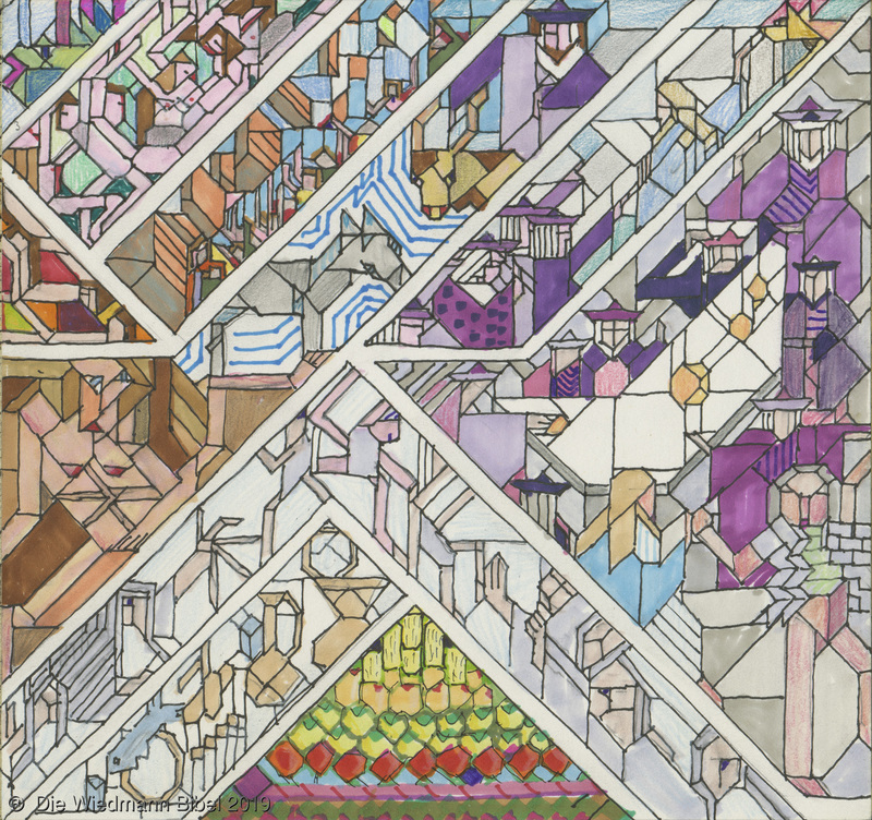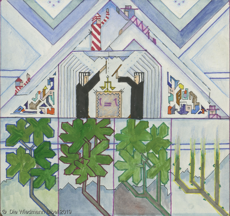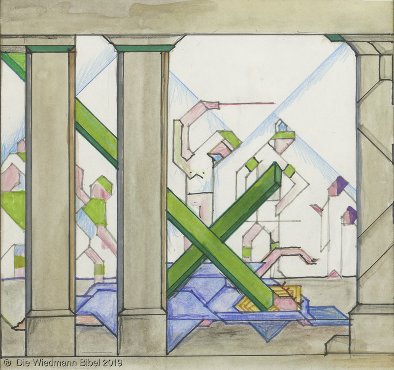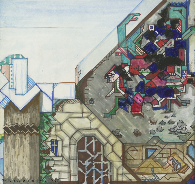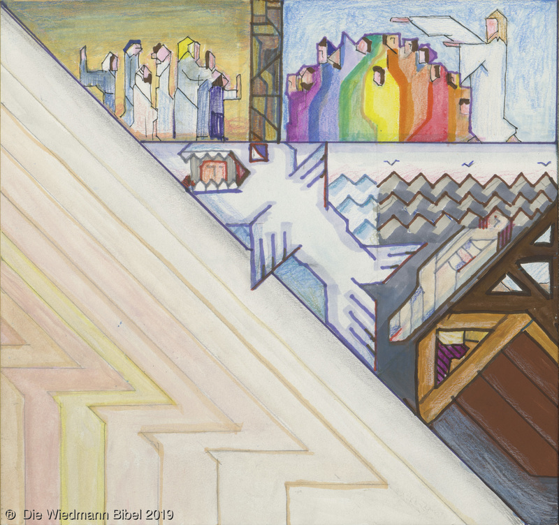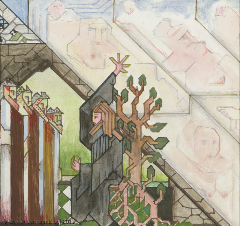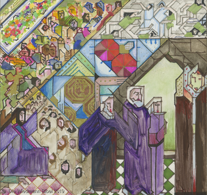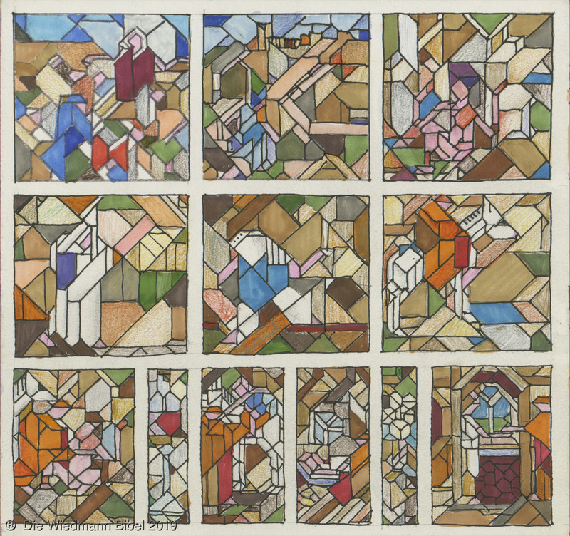 Fensterbild: Jesu auf dem Markt / Aussätzige rufen Jesu um Hilfe / Aussätzige bei Phanisaun Samariter merkt seine Heilung und kehrt um / Er dankt Gott / Jesu segnet ihn geheilte Aussätzige / sind je 3 unter sich / Frage Jesu: es waren doch 10?
