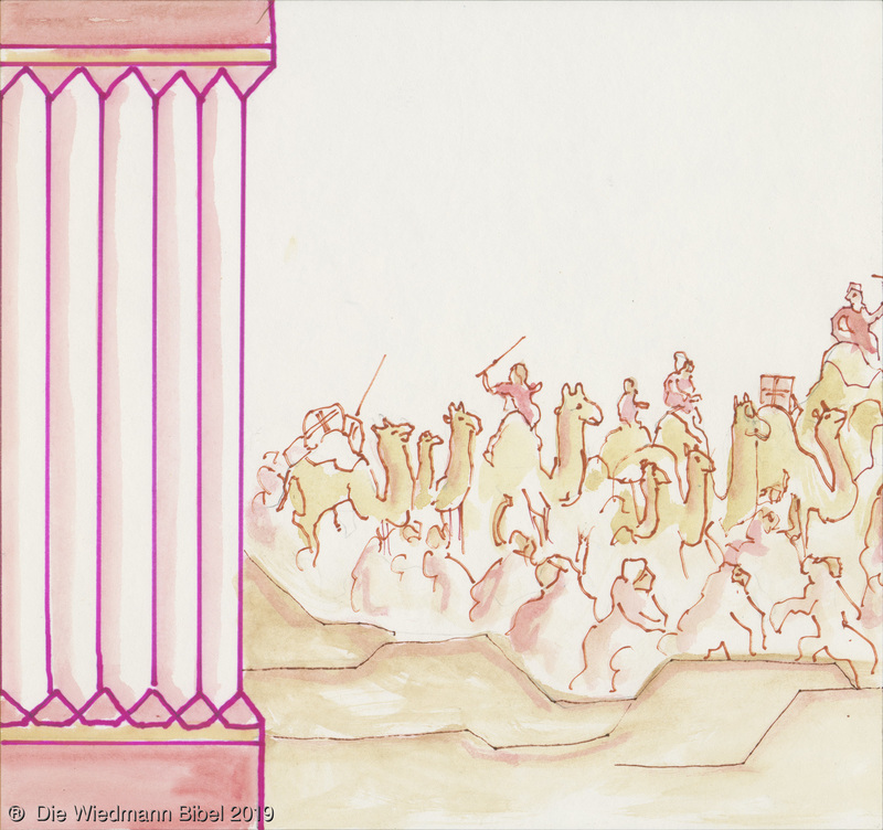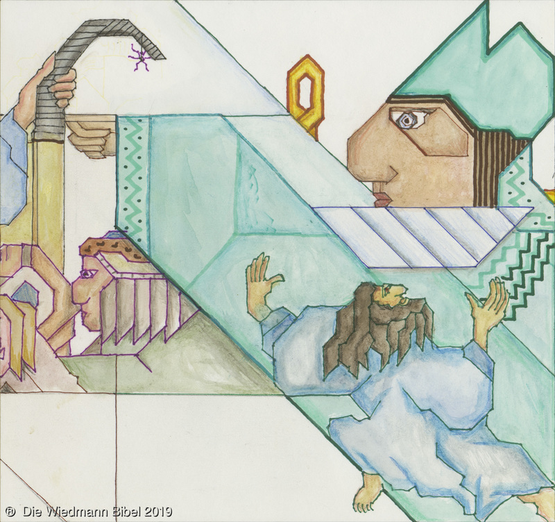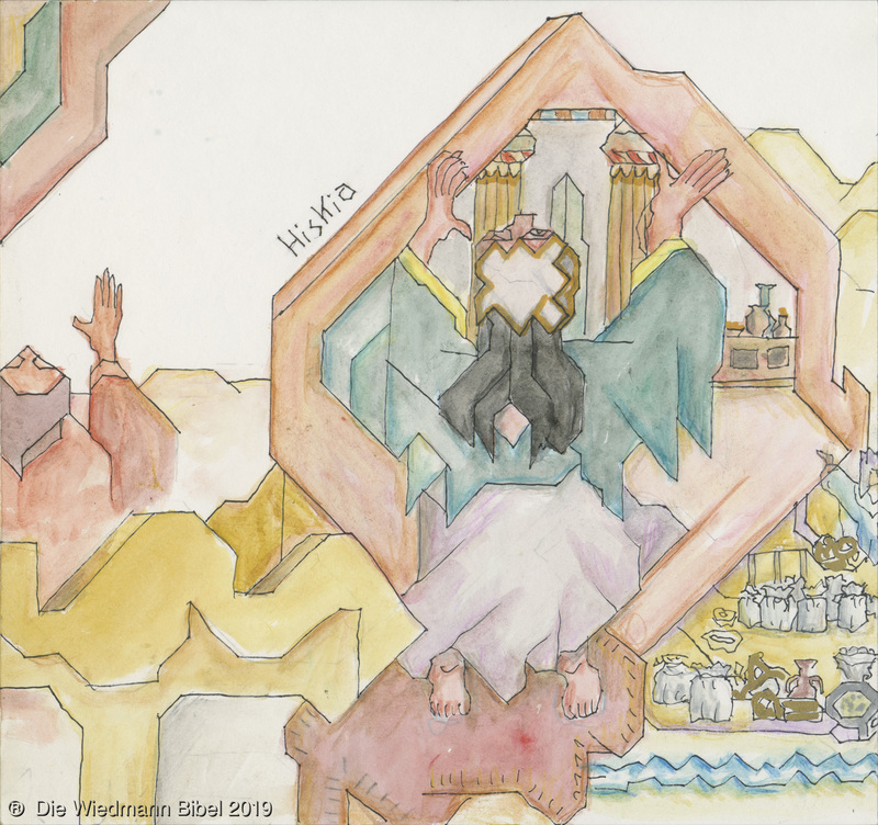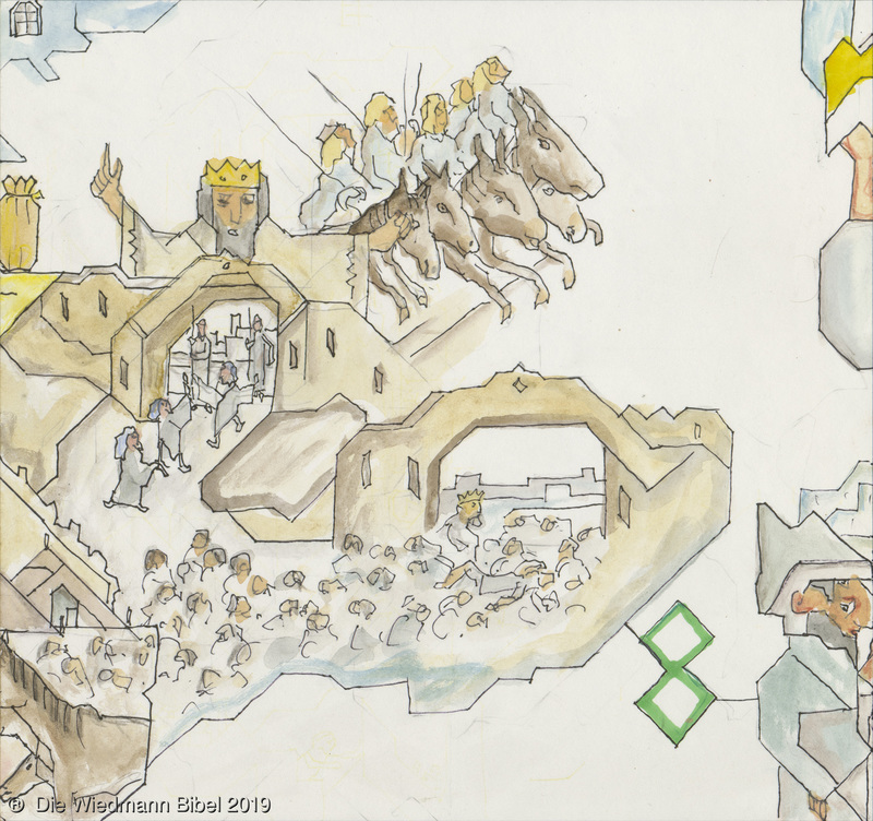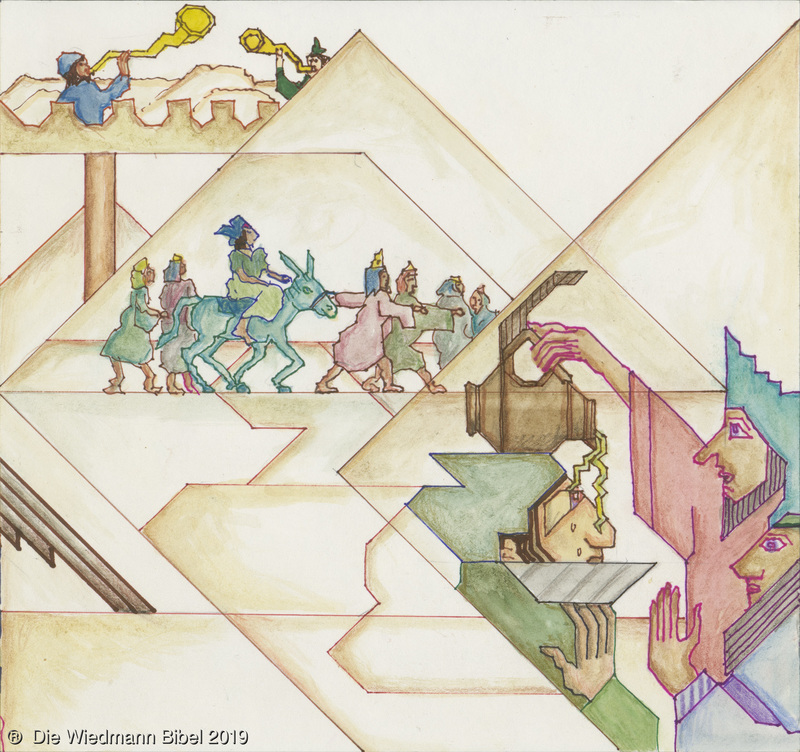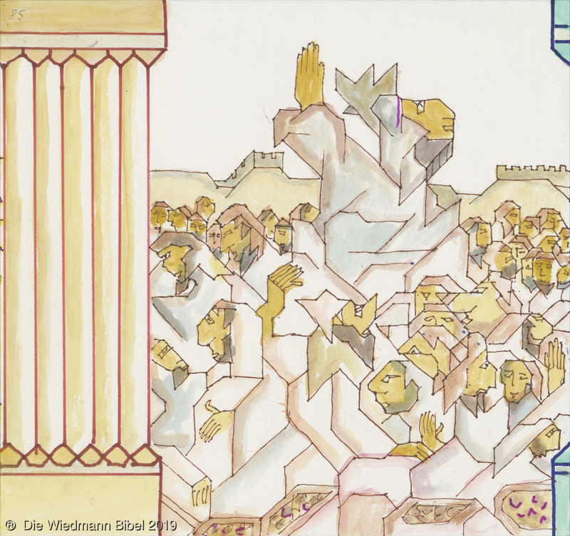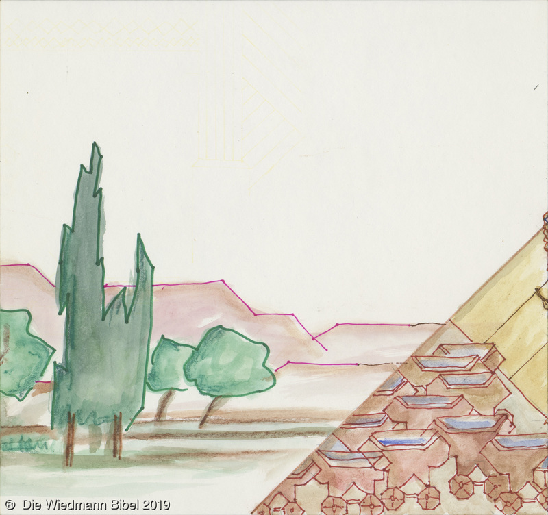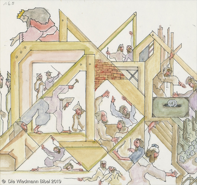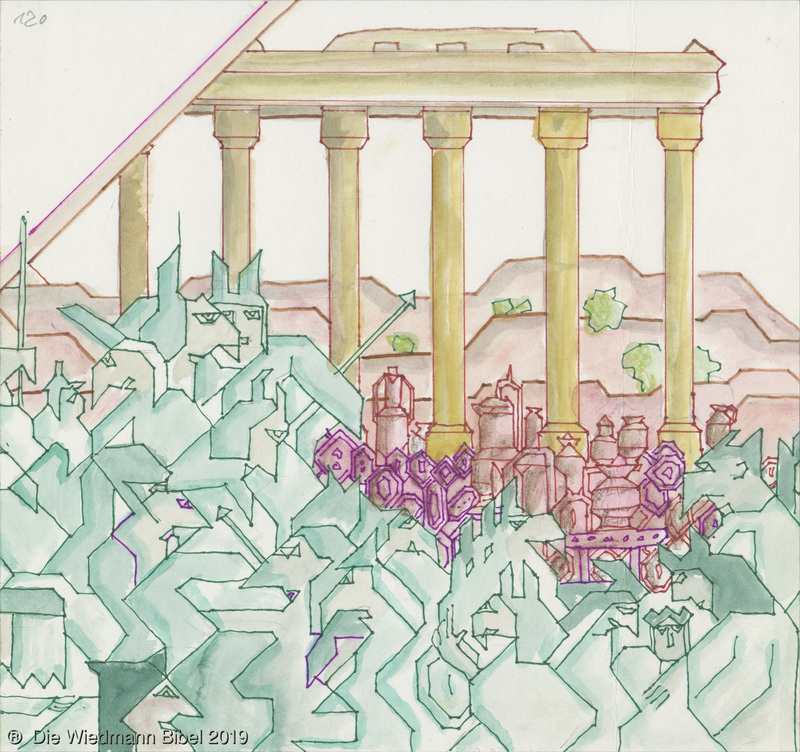 Salomo liess Hiram aus Tyrus kommen. Er führte alle Arbeit aus. Formte die zwei ehernen, kupfernen Säulen. 18 Ellen betrug die Höhe der einen und ein Band von zwölf Ellen umspannte sie. Vier Finger betrug ihre Dicke. Sie war hohl. Er machte zwei Kapitelle, um sie oben auf zu setzen, aus Erz. Fünf Ellen hoch. Und an jedem Knauf (Kapitell), die aus Kupfer gegossen sind, war Gitterwerk, sieben geflochtene Reifen, wie Ketten. An jedem Knauf waren zwei Reihen Granatäpfel ringsum. Und die Knäufe waren wie Lilien, jeder vier Ellen dick. Und es waren 200 Granatäpfel an den Reihen ringsum oben und unten an dem Gitterwerk, das um die Rundung des Knaufs her ging. Jeweils auf beiden Seiten. Und er richtete sie auf vor der Vorhalle des Tempels. Dann machte er das Meer. 10 Ellen vom einen Rand zum anderen. 30 Ellen war das Maß ringsum. Um das Meer gingen Knoten, an seinem Rand rundherum, je zehn auf eine Elle. Zwei Reihen Knoten. Das Meer stand auf den Hinterteilen von zwölf Rindern. Drei Norden, drei Süden, drei Osten, drei Westen. Das Meer hatte eine handbreite Wand. Es gingen 2000 Eimer hinein (2000 Bat). Und Hiram machte auch Töpfe, Schaufeln und Becken aus Kupfer. Auch alles Gerät für das Haus Gottes ließ Salomo fertigen: den goldenen Altar, zehn goldene Tische, auf denen die Schaubrote liegen. Zehn Leuchter, je fünf zur Linken und rechten Seite des Altars. Goldene Blumen, Lampen und Lichtscheren. Dazu Schalen, Messer, Becken, Löffel und Pfannen aus Gold. Alles war von Gold, auch die Türangeln zum Chor. So wurde das ganze Werk vollendet. Und er brachte ins Haus Gottes alles hinein, was sein Vater David geheiligt hatte und legte es in den Schatz des Hauses.
