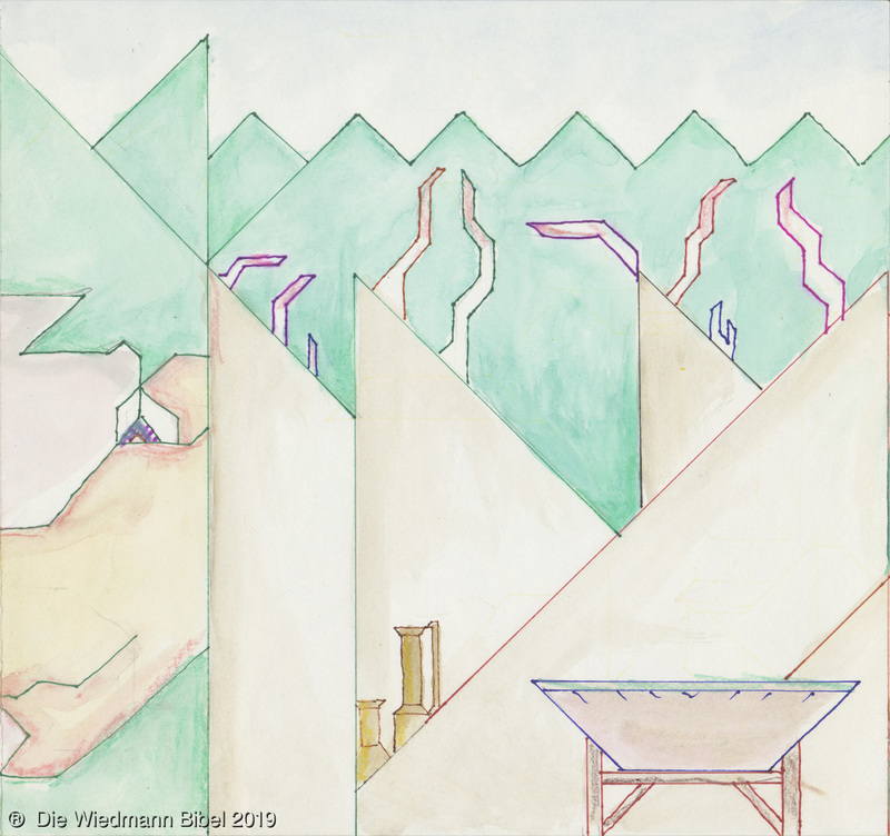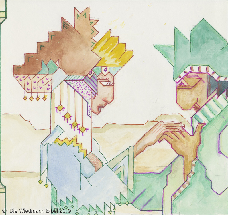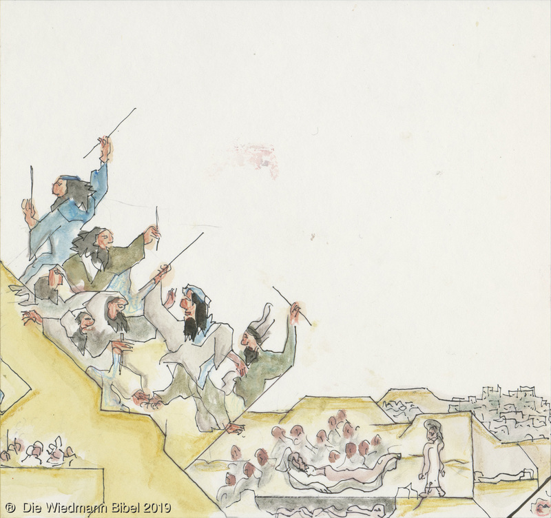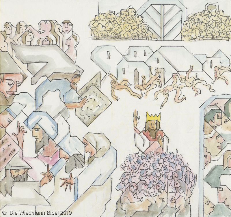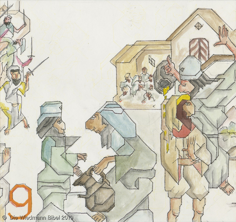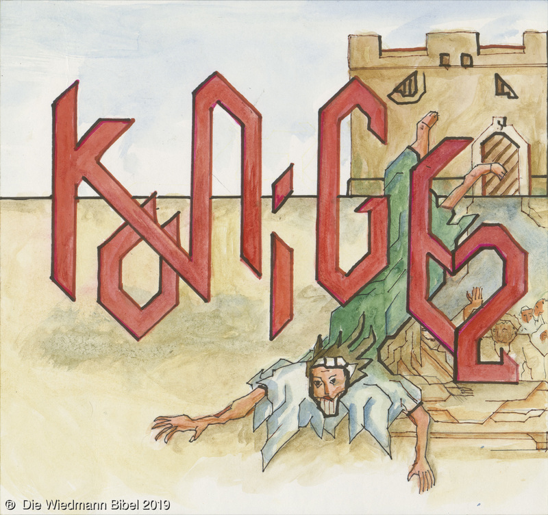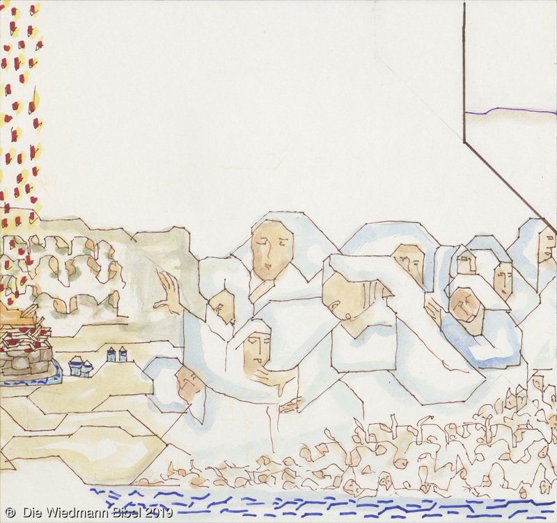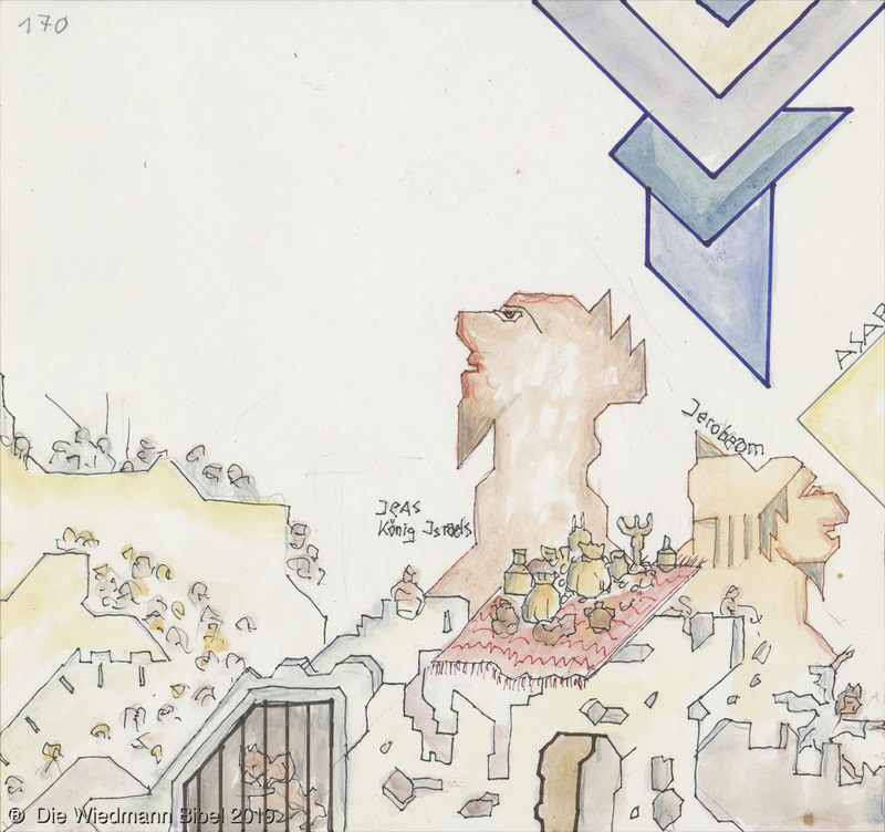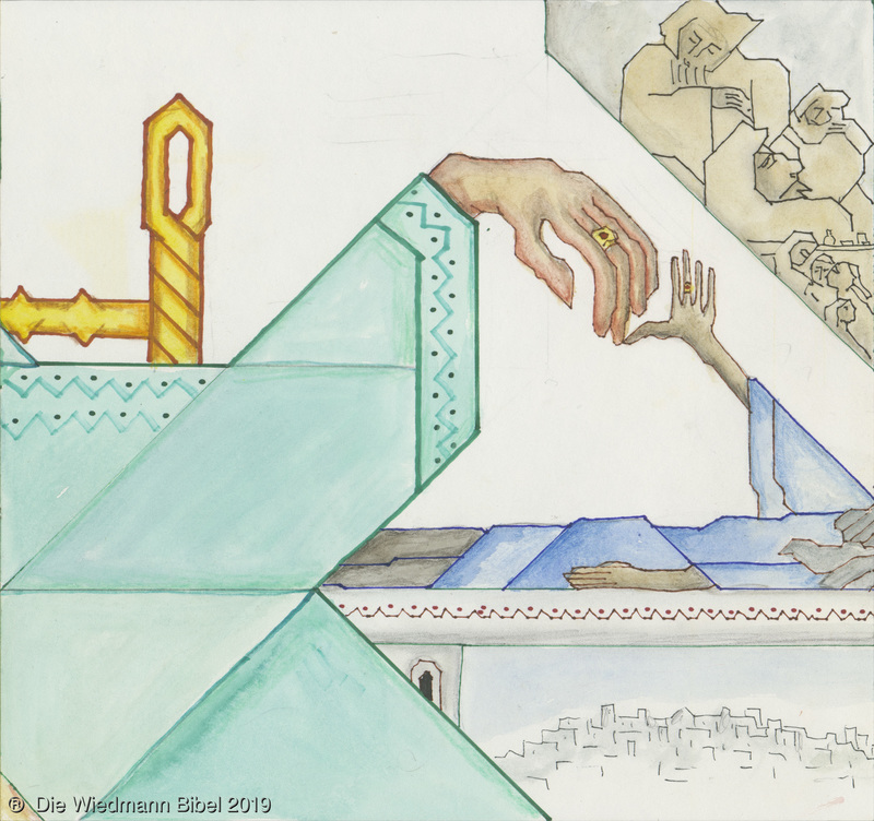 Salomo liess Hiram aus Tyrus kommen. Er führte alle Arbeit aus. Formte die zwei ehernen, kupfernen Säulen. 18 Ellen betrug die Höhe der einen und ein Band von zwölf Ellen umspannte sie. Vier Finger betrug ihre Dicke. Sie war hohl. Er machte zwei Kapitelle, um sie oben auf zu setzen, aus Erz. Fünf Ellen hoch. Und an jedem Knauf (Kapitell), die aus Kupfer gegossen sind, war Gitterwerk, sieben geflochtene Reifen, wie Ketten. An jedem Knauf waren zwei Reihen Granatäpfel ringsum. Und die Knäufe waren wie Lilien, jeder vier Ellen dick. Und es waren 200 Granatäpfel an den Reihen ringsum oben und unten an dem Gitterwerk, das um die Rundung des Knaufs her ging. Jeweils auf beiden Seiten. Und er richtete sie auf vor der Vorhalle des Tempels. Dann machte er das Meer. 10 Ellen vom einen Rand zum anderen. 30 Ellen war das Maß ringsum. Um das Meer gingen Knoten, an seinem Rand rundherum, je zehn auf eine Elle. Zwei Reihen Knoten. Das Meer stand auf den Hinterteilen von zwölf Rindern. Drei Norden, drei Süden, drei Osten, drei Westen. Das Meer hatte eine handbreite Wand. Es gingen 2000 Eimer hinein (2000 Bat). Und Hiram machte auch Töpfe, Schaufeln und Becken aus Kupfer. Auch alles Gerät für das Haus Gottes ließ Salomo fertigen: den goldenen Altar, zehn goldene Tische, auf denen die Schaubrote liegen. Zehn Leuchter, je fünf zur Linken und rechten Seite des Altars. Goldene Blumen, Lampen und Lichtscheren. Dazu Schalen, Messer, Becken, Löffel und Pfannen aus Gold. Alles war von Gold, auch die Türangeln zum Chor. So wurde das ganze Werk vollendet. Und er brachte ins Haus Gottes alles hinein, was sein Vater David geheiligt hatte und legte es in den Schatz des Hauses.