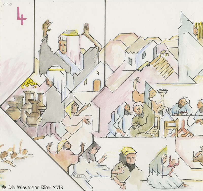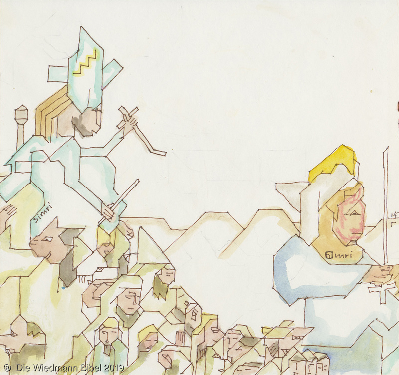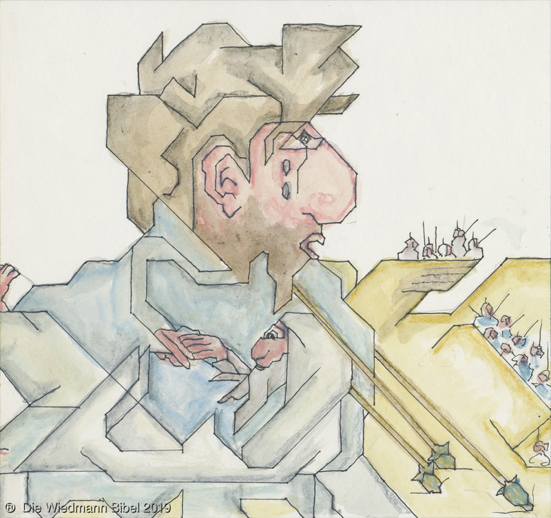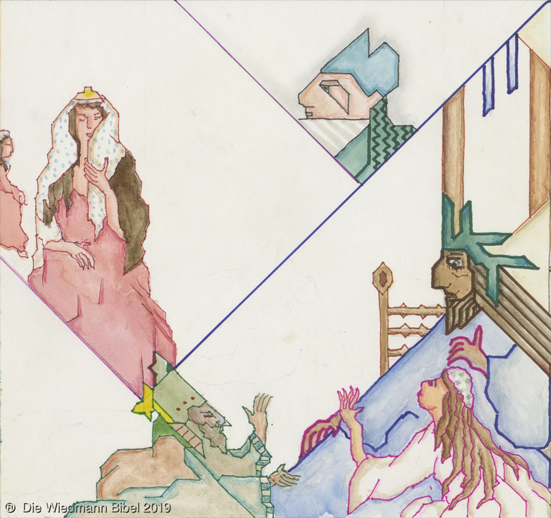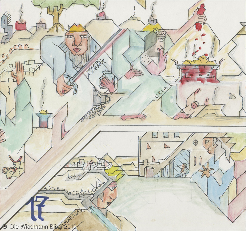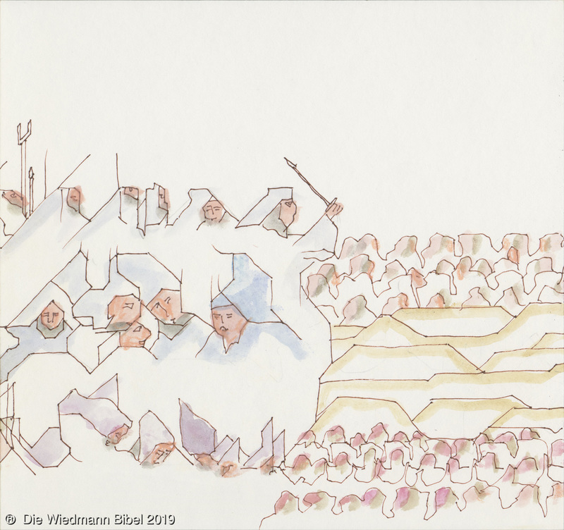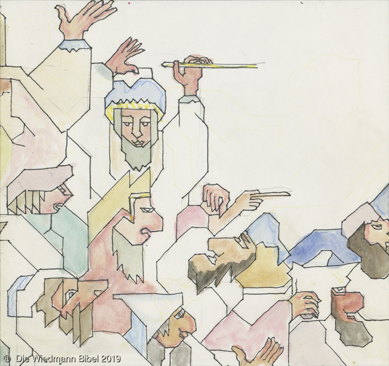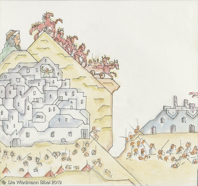 Salomo liess Hiram aus Tyrus kommen. Er führte alle Arbeit aus. Formte die zwei ehernen, kupfernen Säulen. 18 Ellen betrug die Höhe der einen und ein Band von zwölf Ellen umspannte sie. Vier Finger betrug ihre Dicke. Sie war hohl. Er machte zwei Kapitelle, um sie oben auf zu setzen, aus Erz. Fünf Ellen hoch. Und an jedem Knauf (Kapitell), die aus Kupfer gegossen sind, war Gitterwerk, sieben geflochtene Reifen, wie Ketten. An jedem Knauf waren zwei Reihen Granatäpfel ringsum. Und die Knäufe waren wie Lilien, jeder vier Ellen dick. Und es waren 200 Granatäpfel an den Reihen ringsum oben und unten an dem Gitterwerk, das um die Rundung des Knaufs her ging. Jeweils auf beiden Seiten. Und er richtete sie auf vor der Vorhalle des Tempels. Dann machte er das Meer. 10 Ellen vom einen Rand zum anderen. 30 Ellen war das Maß ringsum. Um das Meer gingen Knoten, an seinem Rand rundherum, je zehn auf eine Elle. Zwei Reihen Knoten. Das Meer stand auf den Hinterteilen von zwölf Rindern. Drei Norden, drei Süden, drei Osten, drei Westen. Das Meer hatte eine handbreite Wand. Es gingen 2000 Eimer hinein (2000 Bat). Und Hiram machte auch Töpfe, Schaufeln und Becken aus Kupfer. Auch alles Gerät für das Haus Gottes ließ Salomo fertigen: den goldenen Altar, zehn goldene Tische, auf denen die Schaubrote liegen. Zehn Leuchter, je fünf zur Linken und rechten Seite des Altars. Goldene Blumen, Lampen und Lichtscheren. Dazu Schalen, Messer, Becken, Löffel und Pfannen aus Gold. Alles war von Gold, auch die Türangeln zum Chor. So wurde das ganze Werk vollendet. Und er brachte ins Haus Gottes alles hinein, was sein Vater David geheiligt hatte und legte es in den Schatz des Hauses.