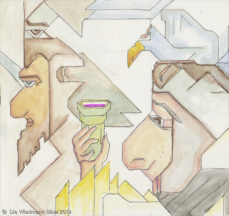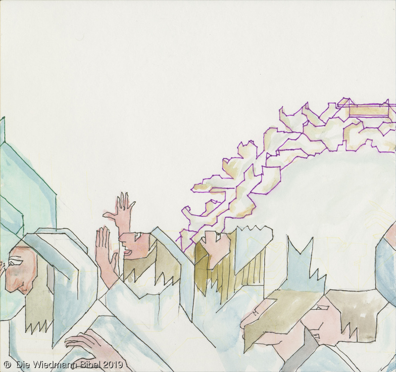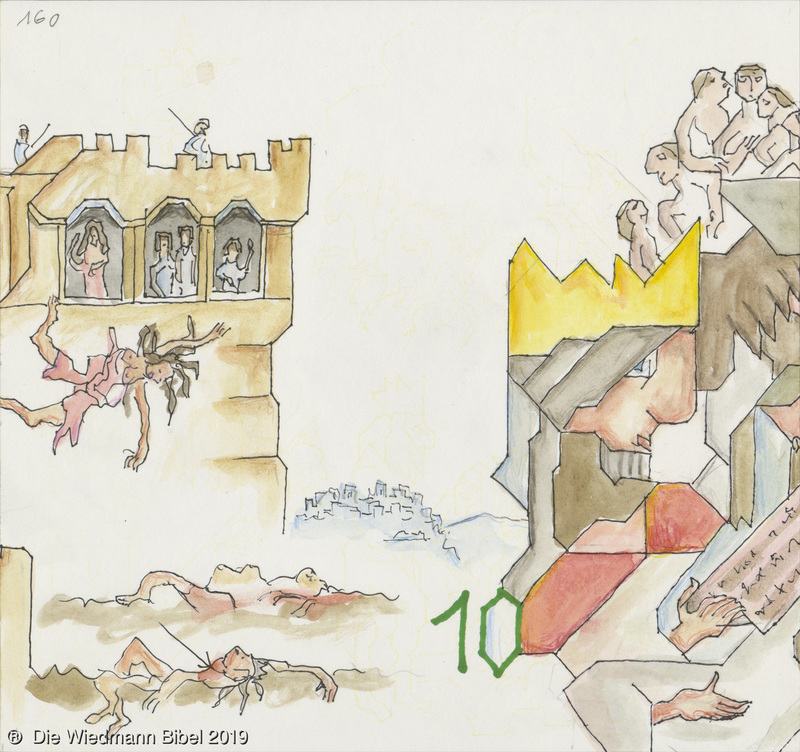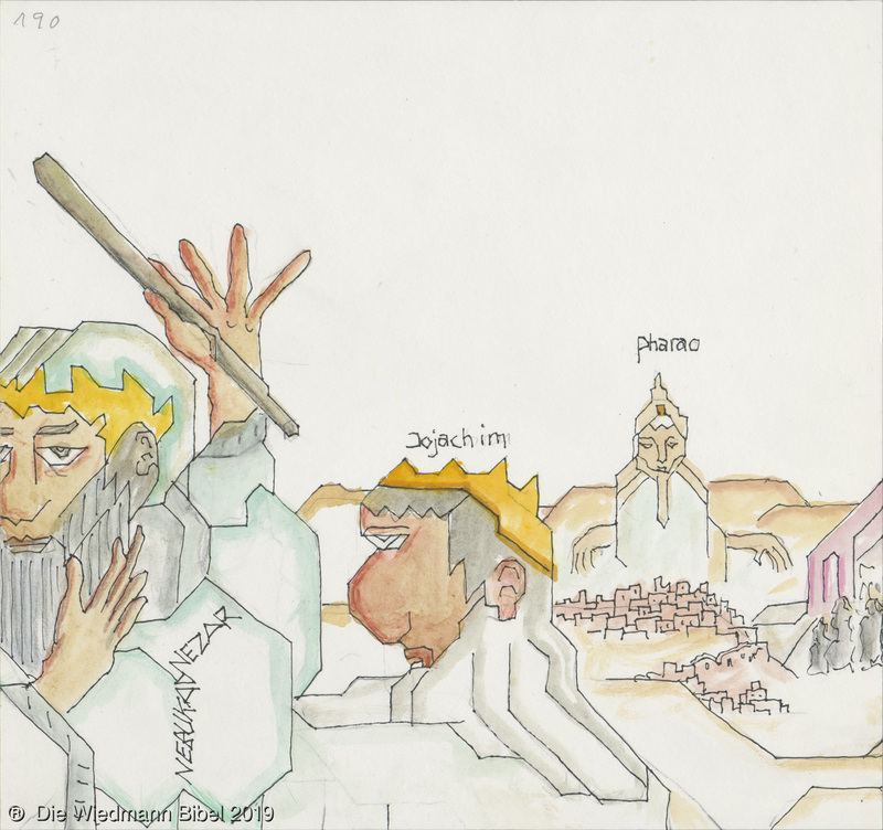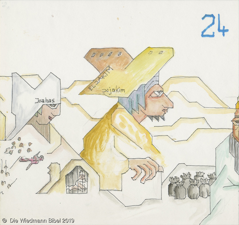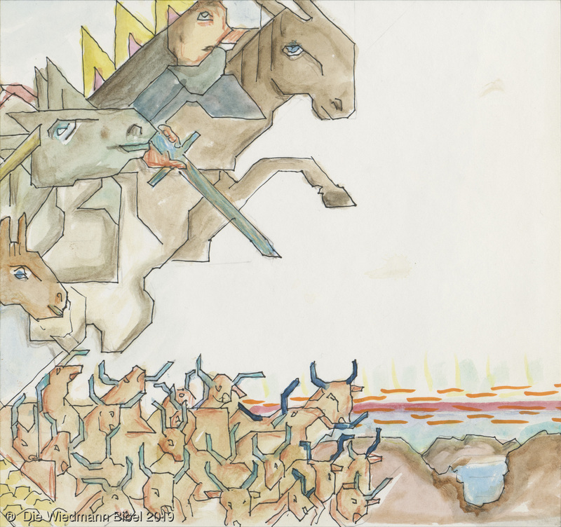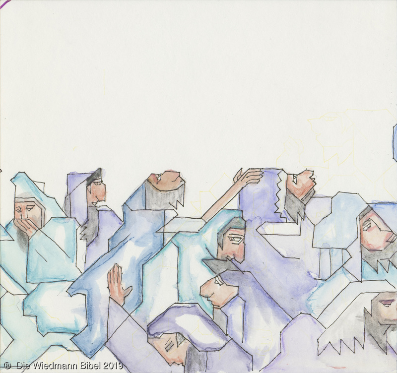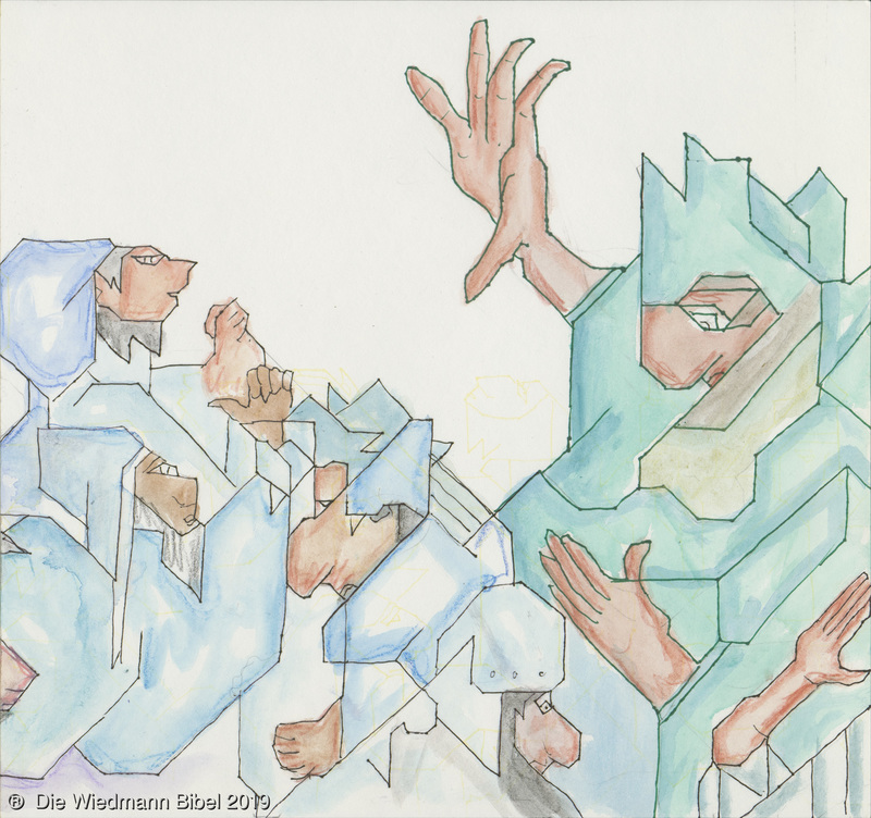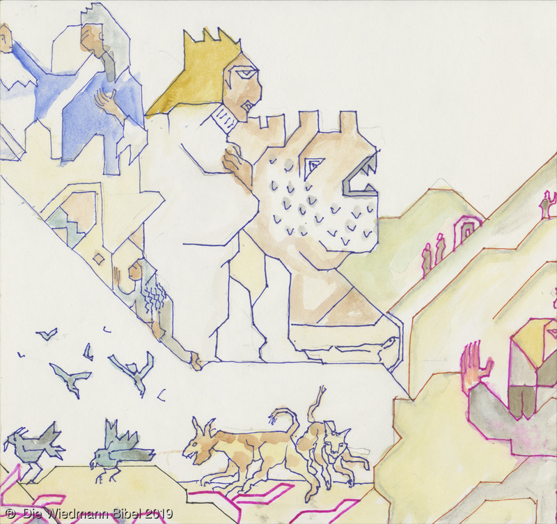 Salomo liess Hiram aus Tyrus kommen. Er führte alle Arbeit aus. Formte die zwei ehernen, kupfernen Säulen. 18 Ellen betrug die Höhe der einen und ein Band von zwölf Ellen umspannte sie. Vier Finger betrug ihre Dicke. Sie war hohl. Er machte zwei Kapitelle, um sie oben auf zu setzen, aus Erz. Fünf Ellen hoch. Und an jedem Knauf (Kapitell), die aus Kupfer gegossen sind, war Gitterwerk, sieben geflochtene Reifen, wie Ketten. An jedem Knauf waren zwei Reihen Granatäpfel ringsum. Und die Knäufe waren wie Lilien, jeder vier Ellen dick. Und es waren 200 Granatäpfel an den Reihen ringsum oben und unten an dem Gitterwerk, das um die Rundung des Knaufs her ging. Jeweils auf beiden Seiten. Und er richtete sie auf vor der Vorhalle des Tempels. Dann machte er das Meer. 10 Ellen vom einen Rand zum anderen. 30 Ellen war das Maß ringsum. Um das Meer gingen Knoten, an seinem Rand rundherum, je zehn auf eine Elle. Zwei Reihen Knoten. Das Meer stand auf den Hinterteilen von zwölf Rindern. Drei Norden, drei Süden, drei Osten, drei Westen. Das Meer hatte eine handbreite Wand. Es gingen 2000 Eimer hinein (2000 Bat). Und Hiram machte auch Töpfe, Schaufeln und Becken aus Kupfer. Auch alles Gerät für das Haus Gottes ließ Salomo fertigen: den goldenen Altar, zehn goldene Tische, auf denen die Schaubrote liegen. Zehn Leuchter, je fünf zur Linken und rechten Seite des Altars. Goldene Blumen, Lampen und Lichtscheren. Dazu Schalen, Messer, Becken, Löffel und Pfannen aus Gold. Alles war von Gold, auch die Türangeln zum Chor. So wurde das ganze Werk vollendet. Und er brachte ins Haus Gottes alles hinein, was sein Vater David geheiligt hatte und legte es in den Schatz des Hauses.