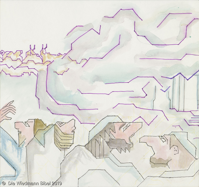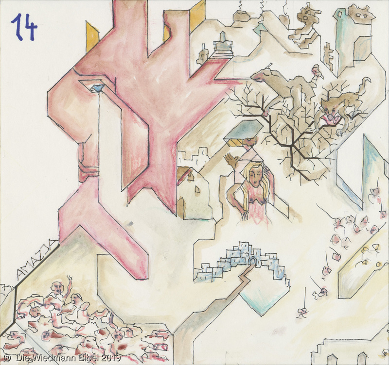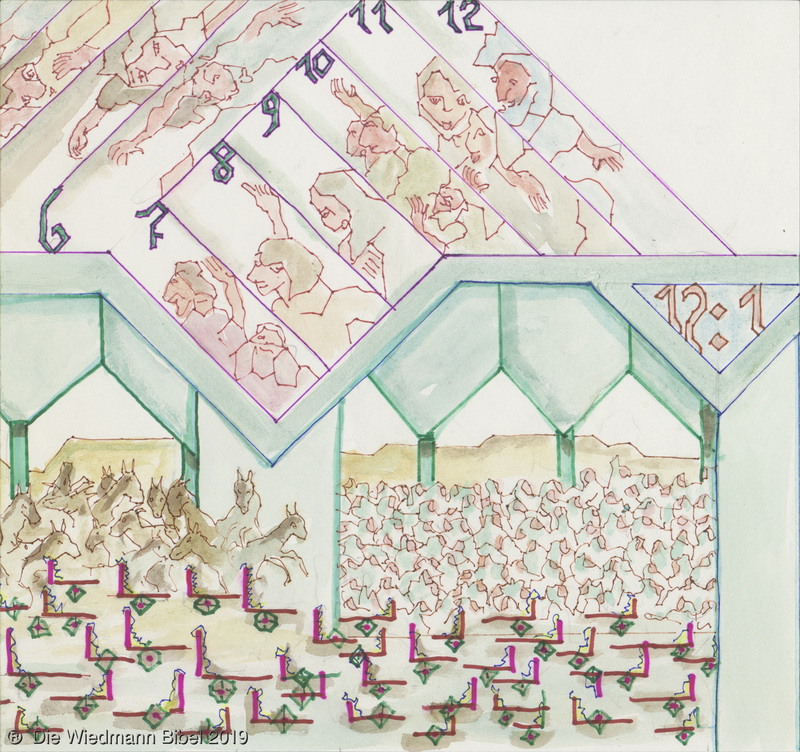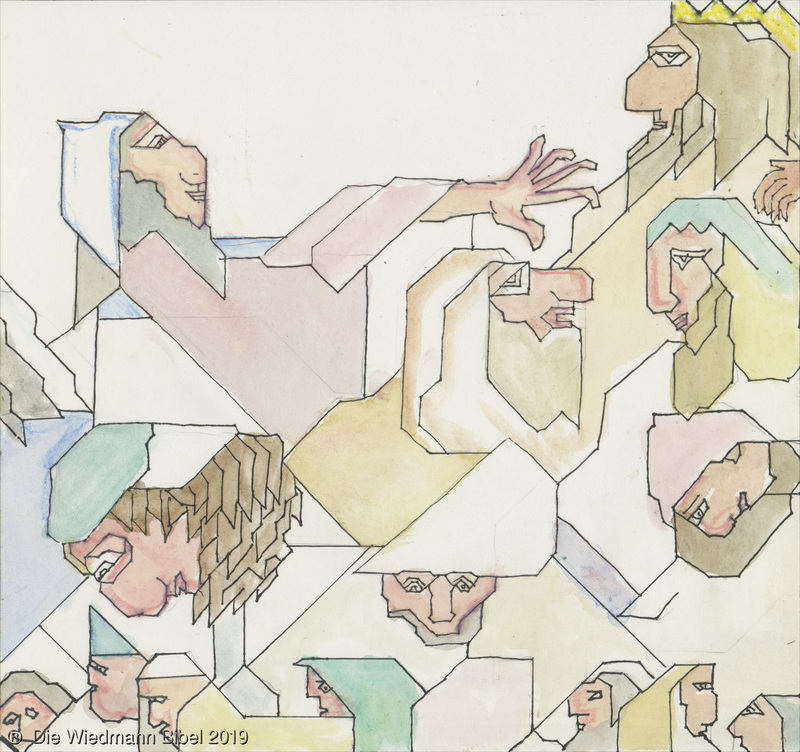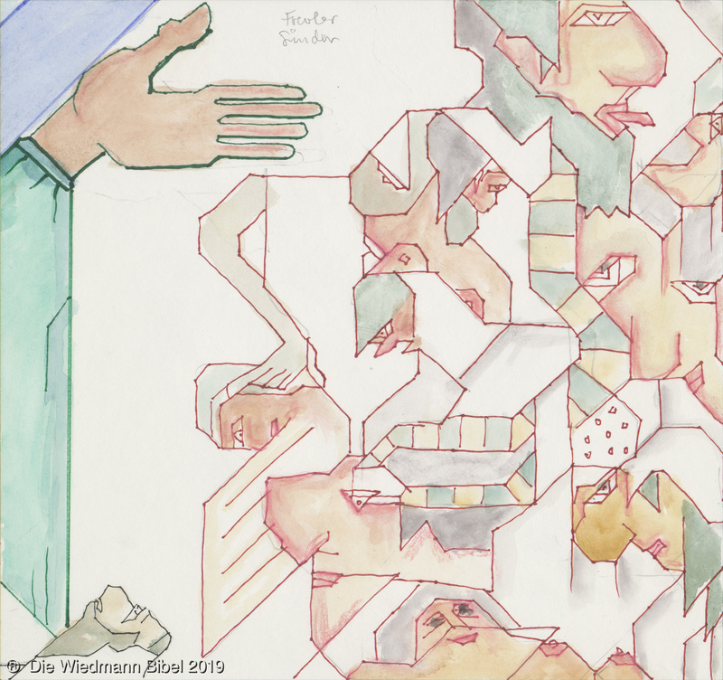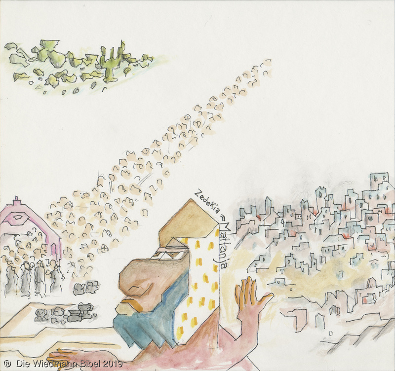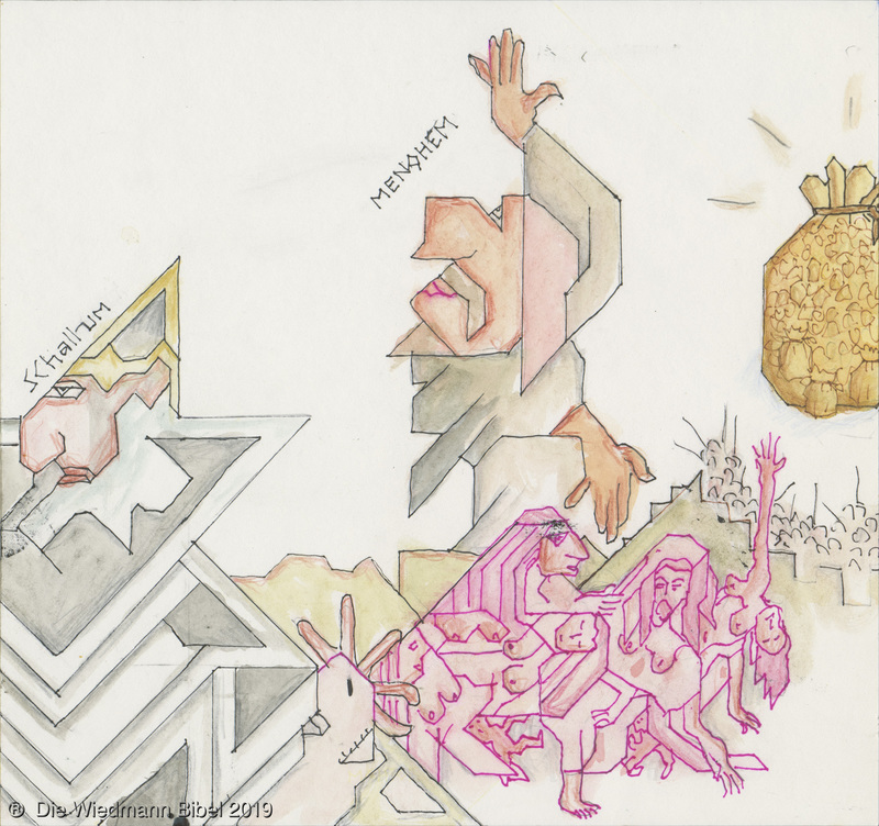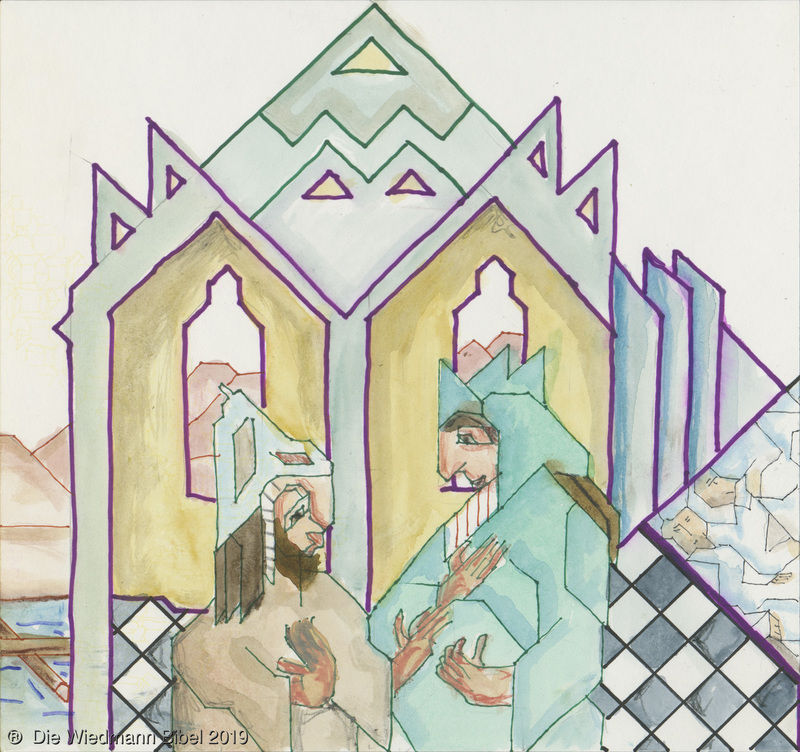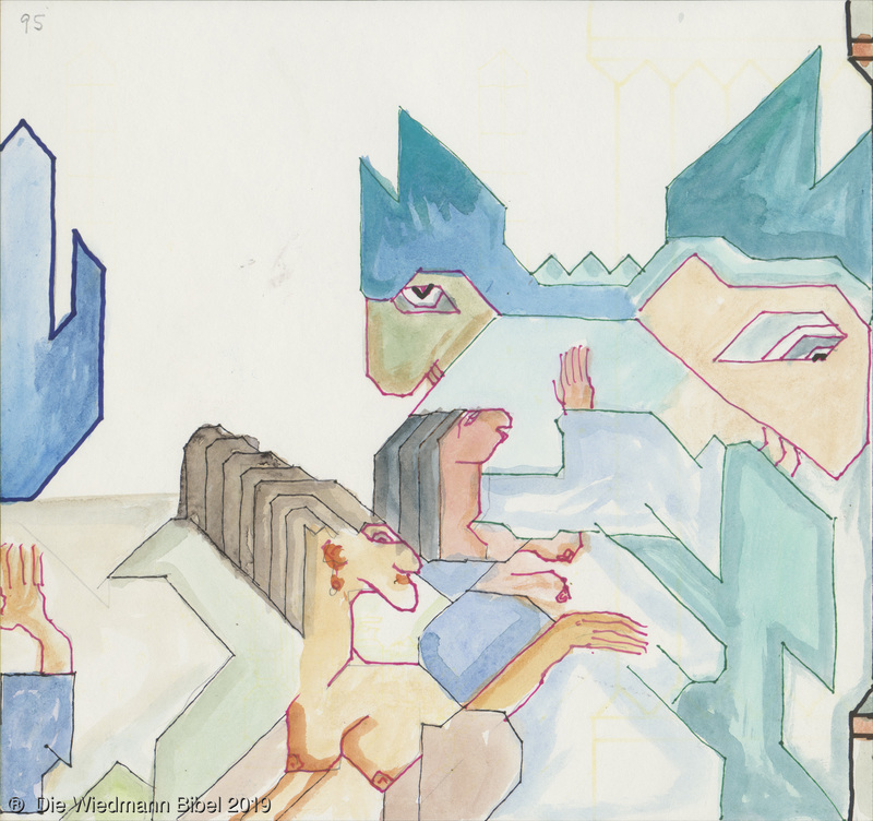 Salomo liess Hiram aus Tyrus kommen. Er führte alle Arbeit aus. Formte die zwei ehernen, kupfernen Säulen. 18 Ellen betrug die Höhe der einen und ein Band von zwölf Ellen umspannte sie. Vier Finger betrug ihre Dicke. Sie war hohl. Er machte zwei Kapitelle, um sie oben auf zu setzen, aus Erz. Fünf Ellen hoch. Und an jedem Knauf (Kapitell), die aus Kupfer gegossen sind, war Gitterwerk, sieben geflochtene Reifen, wie Ketten. An jedem Knauf waren zwei Reihen Granatäpfel ringsum. Und die Knäufe waren wie Lilien, jeder vier Ellen dick. Und es waren 200 Granatäpfel an den Reihen ringsum oben und unten an dem Gitterwerk, das um die Rundung des Knaufs her ging. Jeweils auf beiden Seiten. Und er richtete sie auf vor der Vorhalle des Tempels. Dann machte er das Meer. 10 Ellen vom einen Rand zum anderen. 30 Ellen war das Maß ringsum. Um das Meer gingen Knoten, an seinem Rand rundherum, je zehn auf eine Elle. Zwei Reihen Knoten. Das Meer stand auf den Hinterteilen von zwölf Rindern. Drei Norden, drei Süden, drei Osten, drei Westen. Das Meer hatte eine handbreite Wand. Es gingen 2000 Eimer hinein (2000 Bat). Und Hiram machte auch Töpfe, Schaufeln und Becken aus Kupfer. Auch alles Gerät für das Haus Gottes ließ Salomo fertigen: den goldenen Altar, zehn goldene Tische, auf denen die Schaubrote liegen. Zehn Leuchter, je fünf zur Linken und rechten Seite des Altars. Goldene Blumen, Lampen und Lichtscheren. Dazu Schalen, Messer, Becken, Löffel und Pfannen aus Gold. Alles war von Gold, auch die Türangeln zum Chor. So wurde das ganze Werk vollendet. Und er brachte ins Haus Gottes alles hinein, was sein Vater David geheiligt hatte und legte es in den Schatz des Hauses.